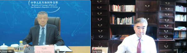 皇冠体育足球中国政府朝鲜半岛事务相称代表刘晓明同好意思国对朝战略相称代表金圣视频通话